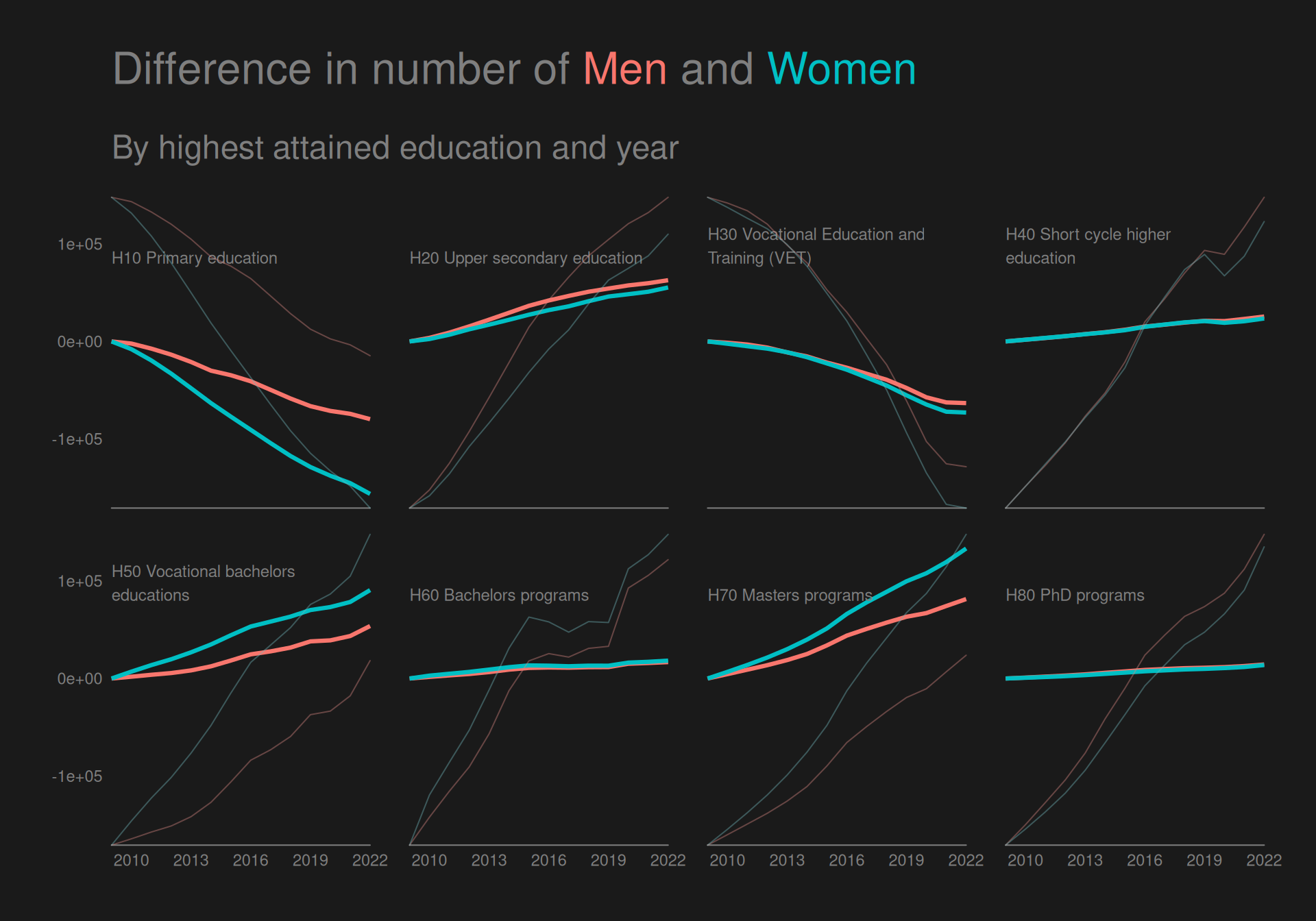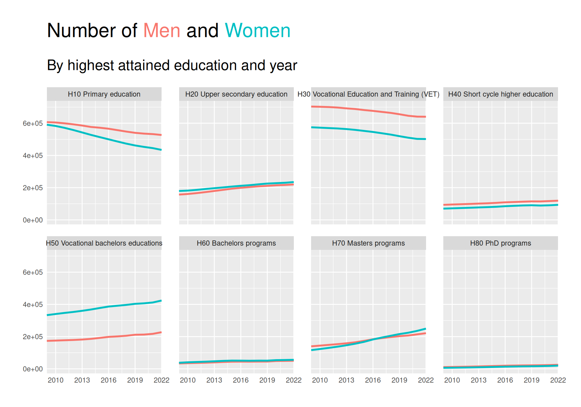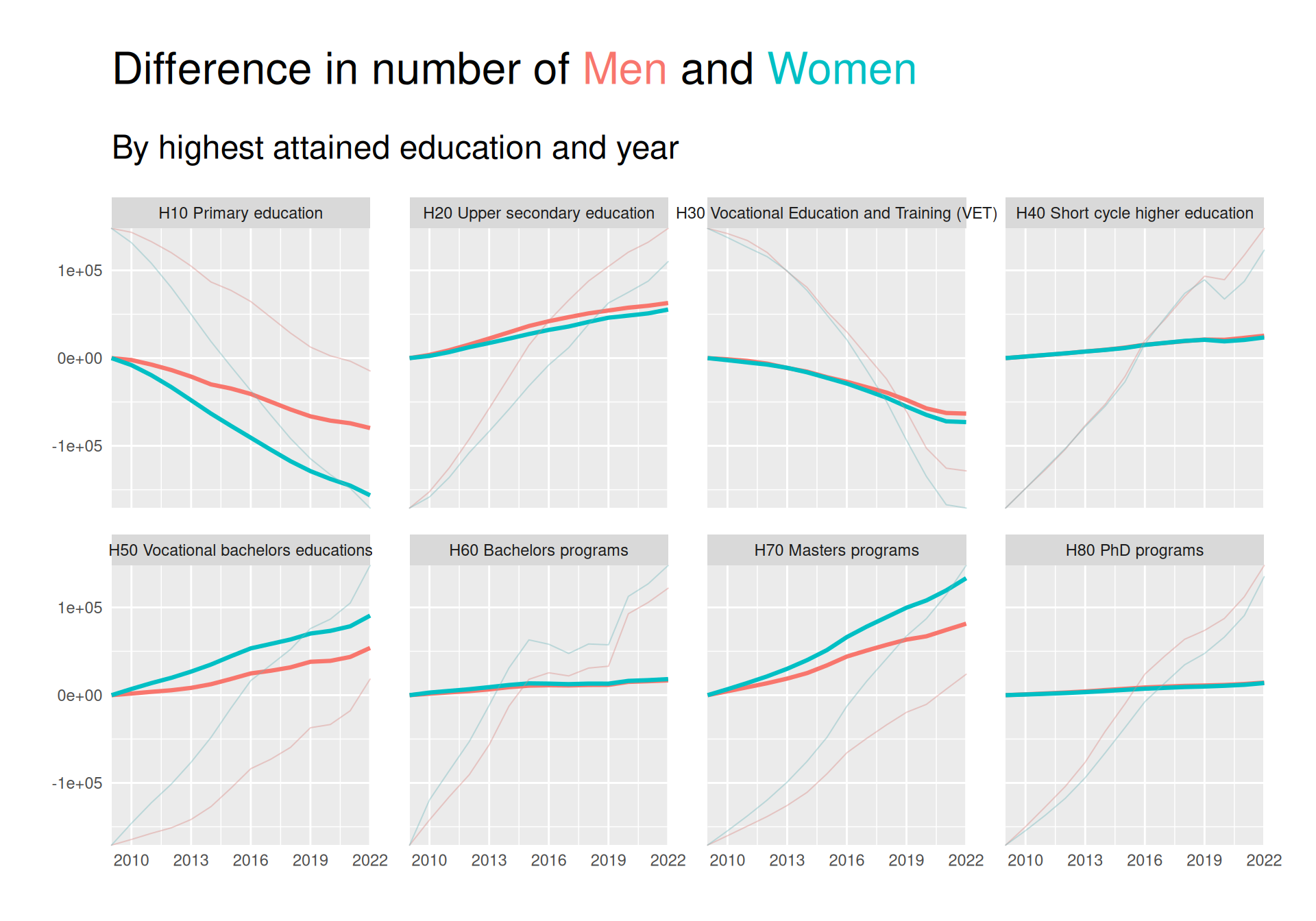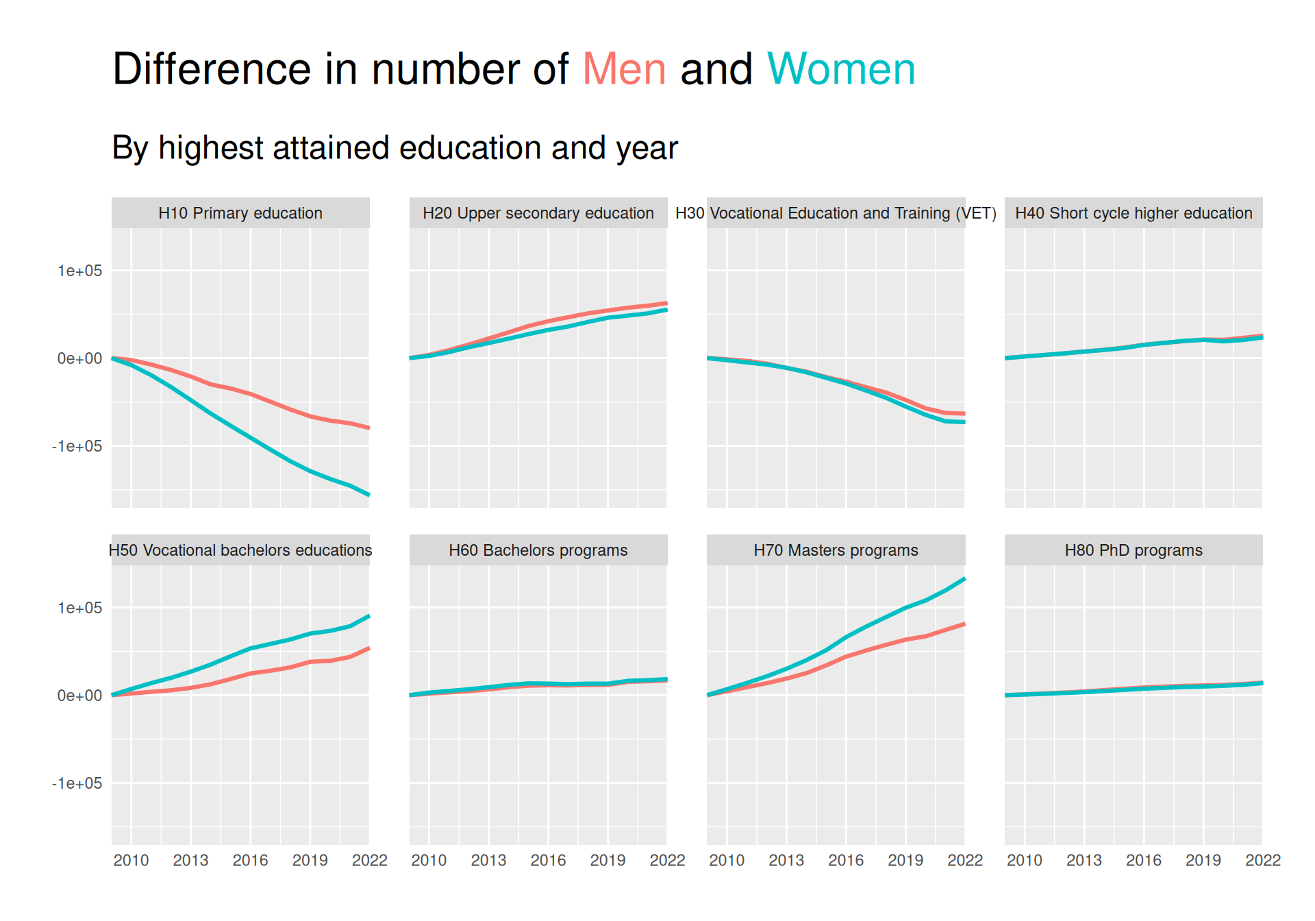 We see that a big decrease in the group of “H10 Primary education” for both men and women, though most drastic for women. The same is true for “H30 Vocational education and training (VET)”, while all other groups have seen increases. Women have had a bigger increase than men in both “H50 Vocational bachelors educations”, “H60 Bachelors programs” and “H70 Masters programs”, while also having almost the same increase as men for “H80 PhD programs”.