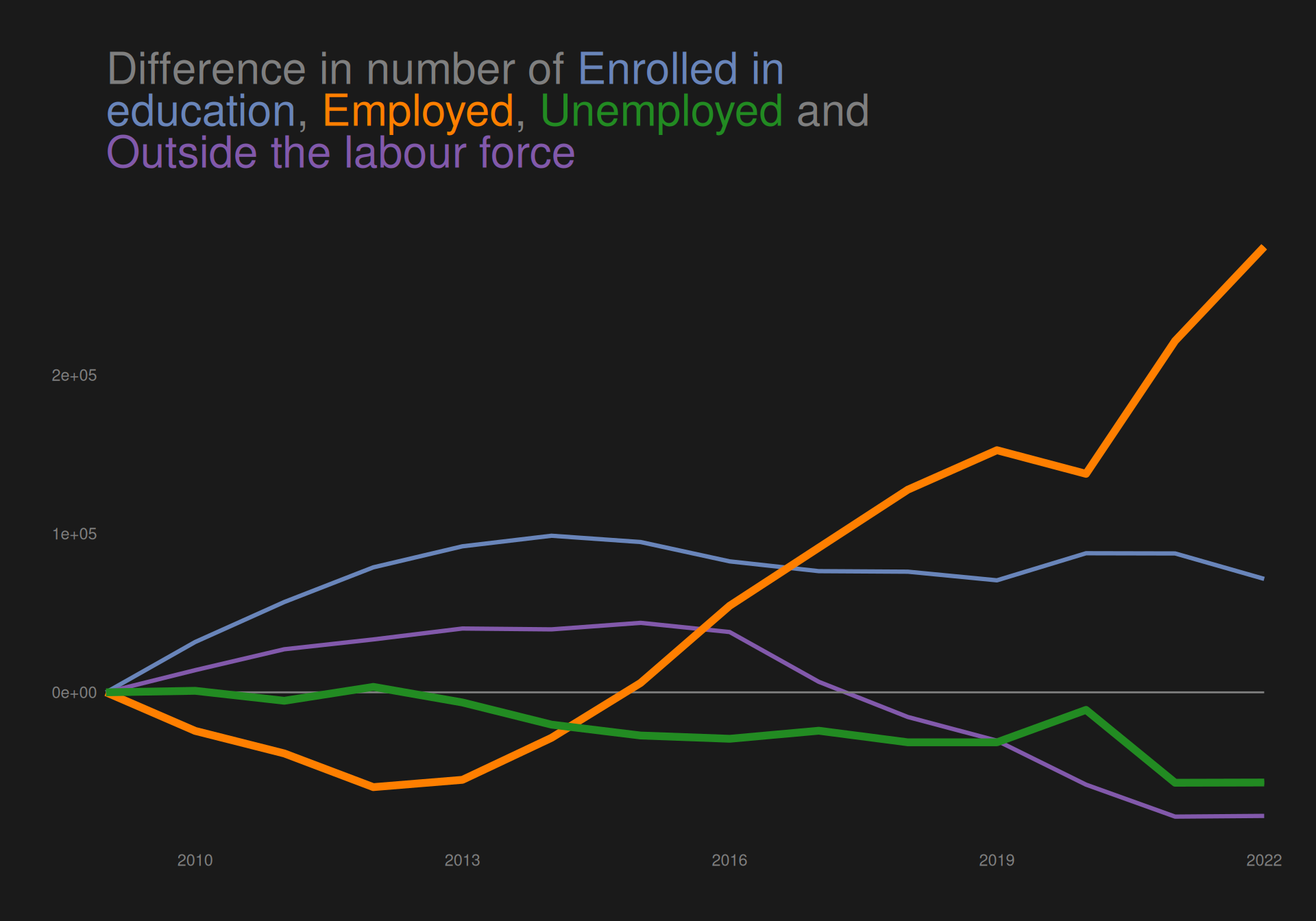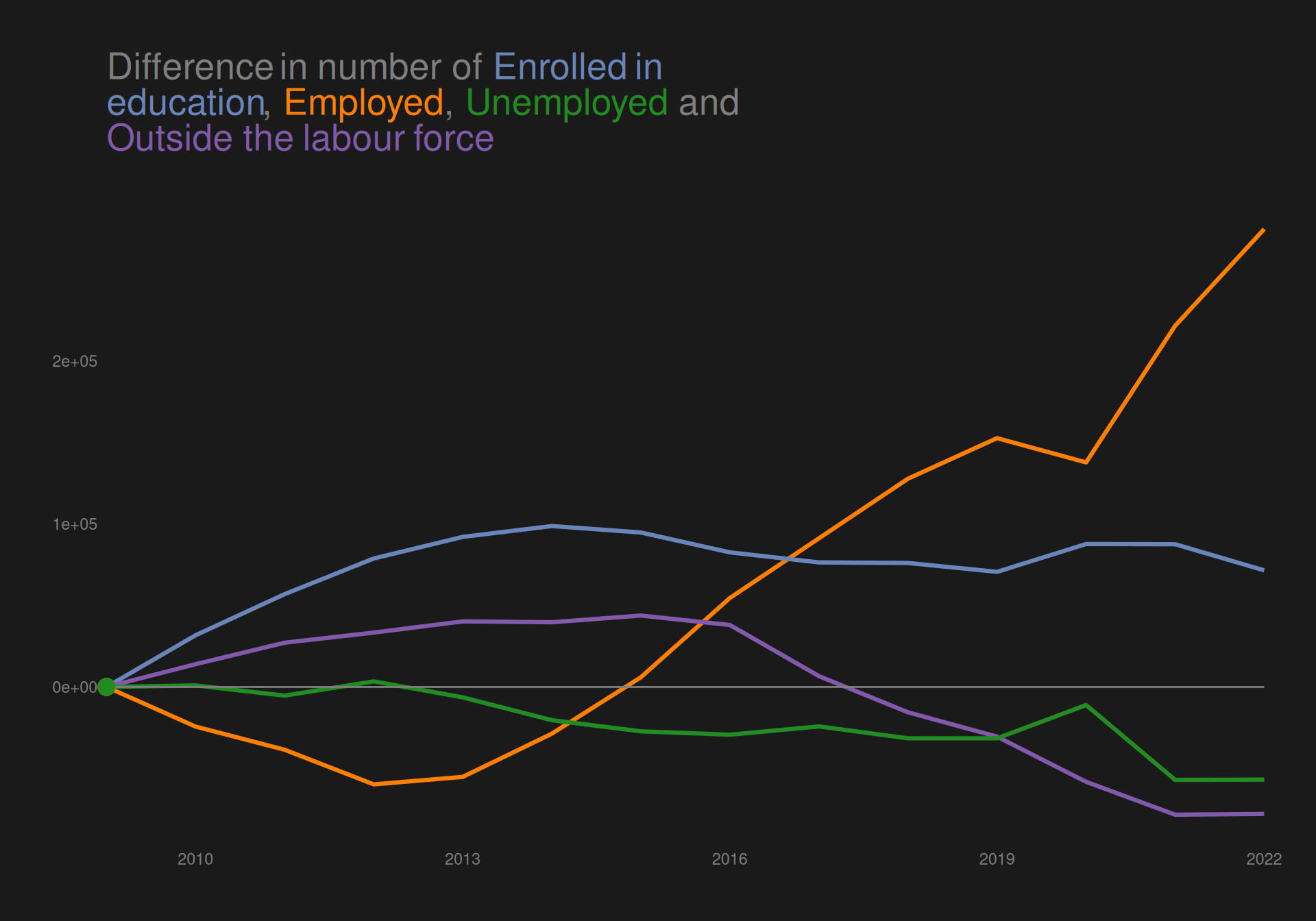 The plot shows an increase in people “enrolled in education” and “employed” from 2009 to 2022, while both “outside the labour force” and “unemplpyed” has decreased across the period.