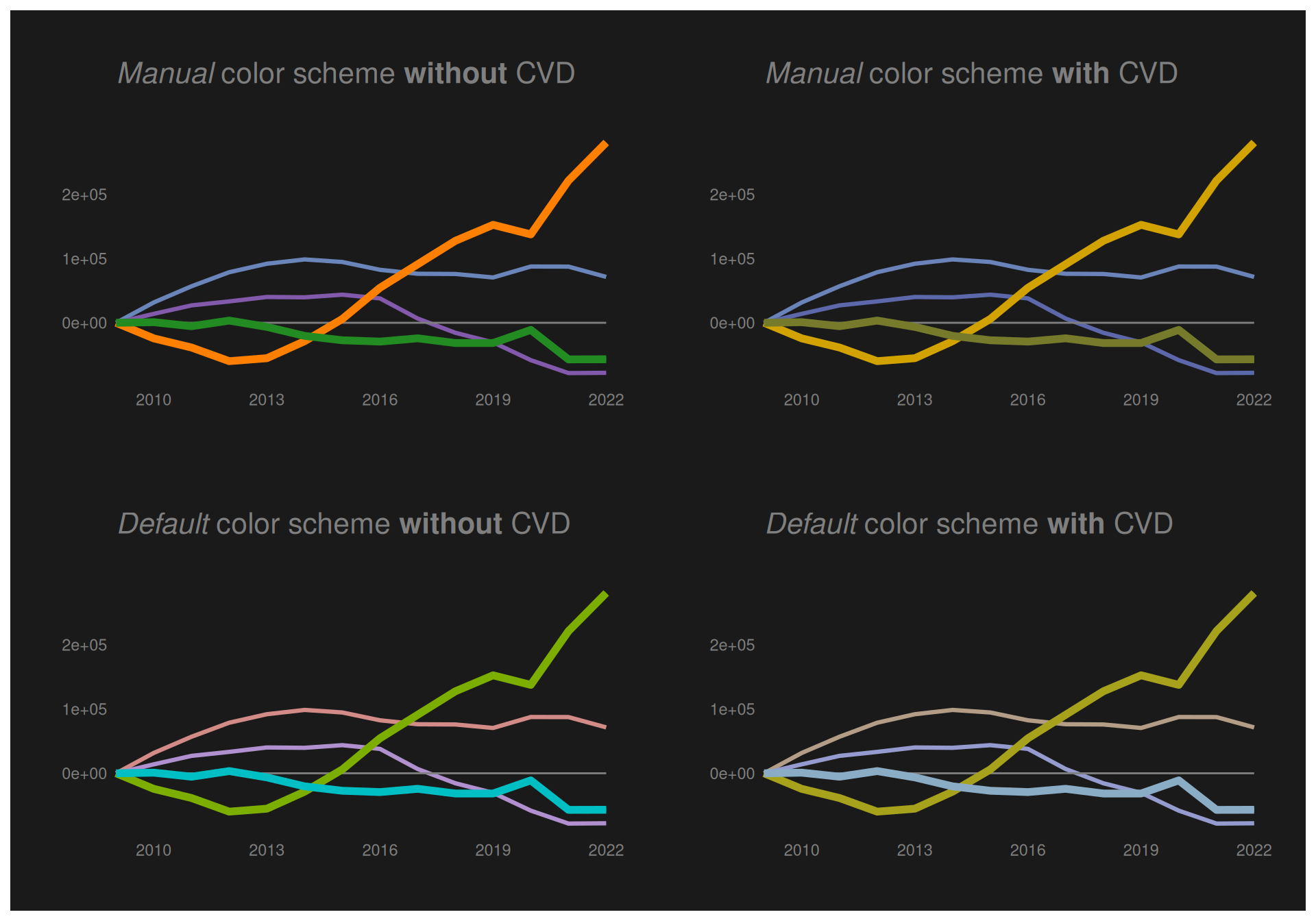 We see that though the colors are not quite as distinguishable for a person with deutan color blindness, the plots using both color schemes are reasonably readable for a person with CVD.