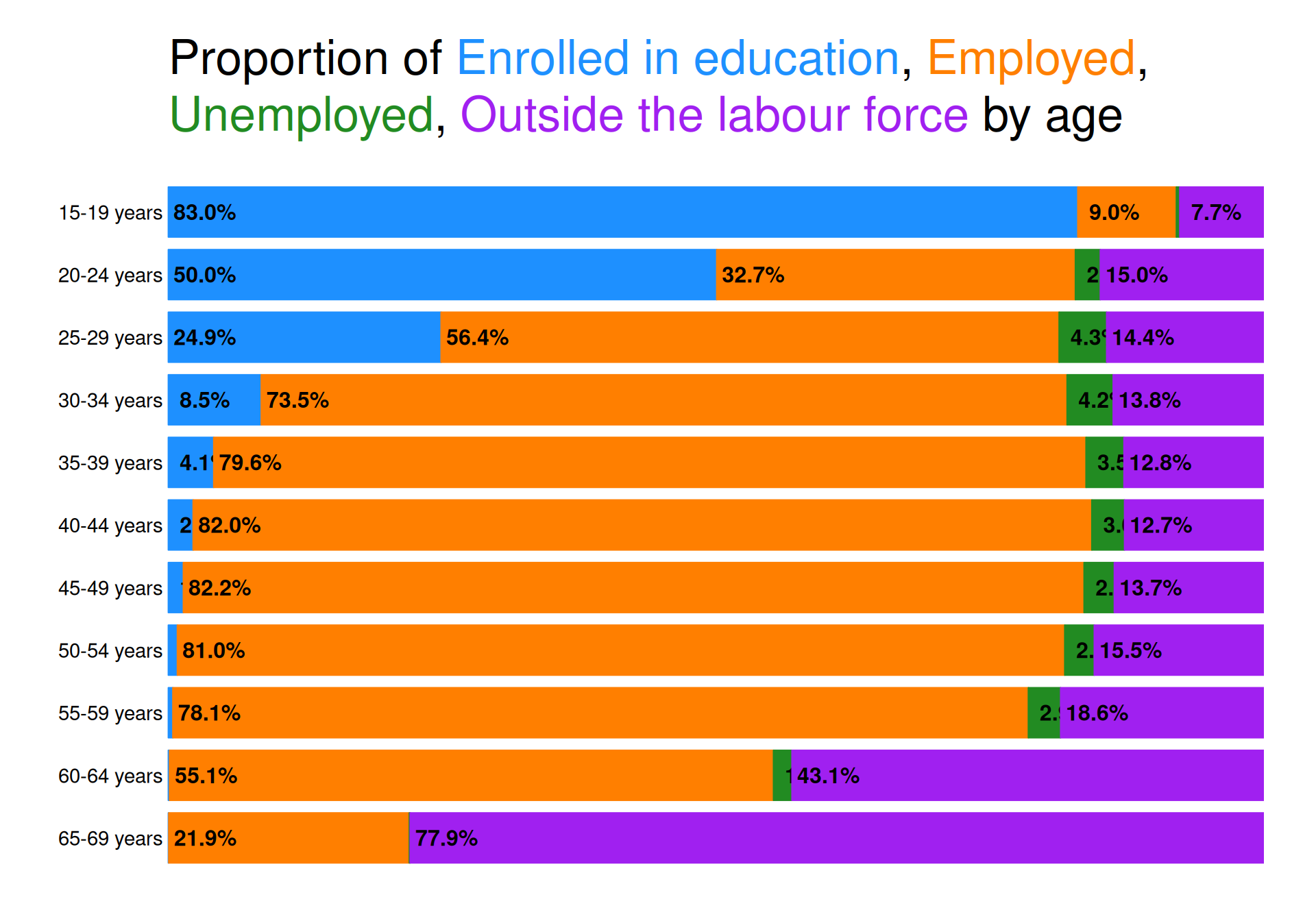 Not surprisingly, the number of “Enrolled in education” is monotonically decreasing with age. The reverse relationship might have been expected for “Outside the labour force”, however, this is not entirely true as groups 20-24, 25-29 and 30-34 all have a larger proportion of people “Outside the labour force” than age groups 35-39, 40-44 and 45-49. Onwards from there, we do however see a drastic monotonic increase as we near retirement age (which was recently upped to 70 years in Denmark).
