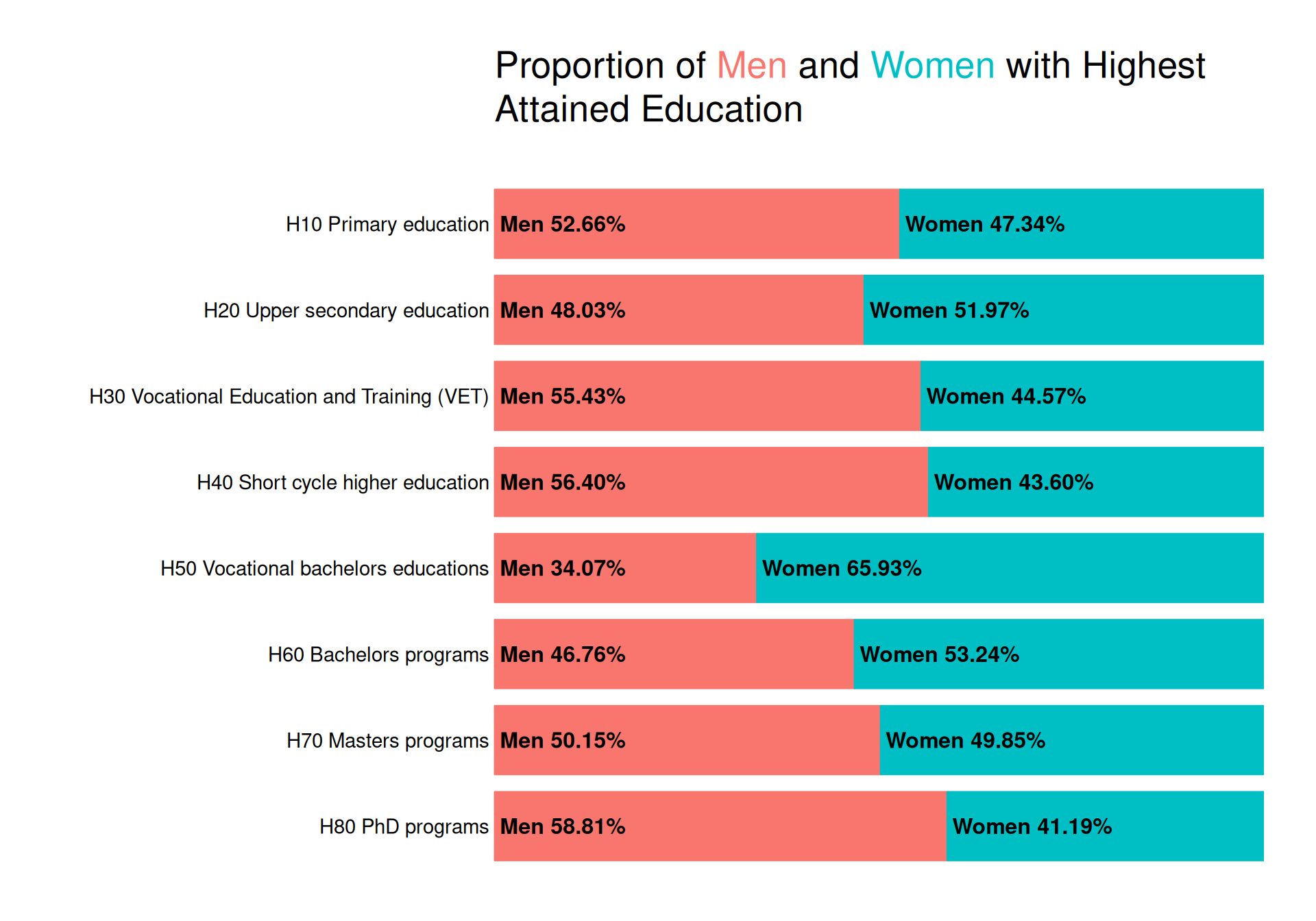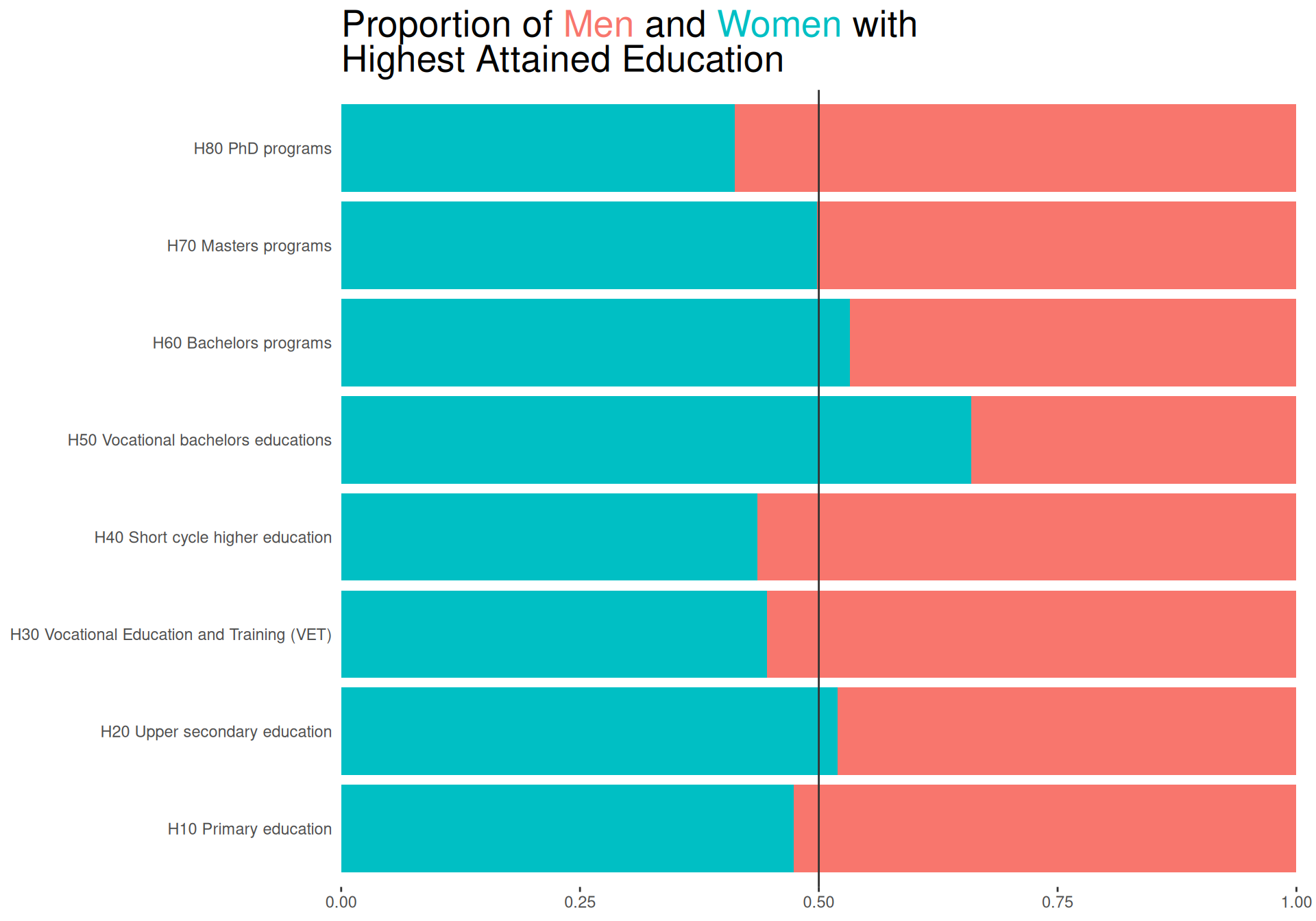 We note that men are a majority of those with “H10 Primary education”, “H30 Vocational education and training (VET)” and “H40 Short cycle higher education”, while more women have highest attained educations of “H50 Vocational bachelors educations” and “H60 Bachelors programs”. For “H70 Masters programs”, the proportion of men and women is almost exactly 50/50, but for “H80 PhD programs” almost 60% are men.
