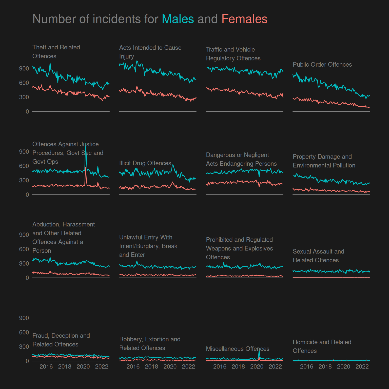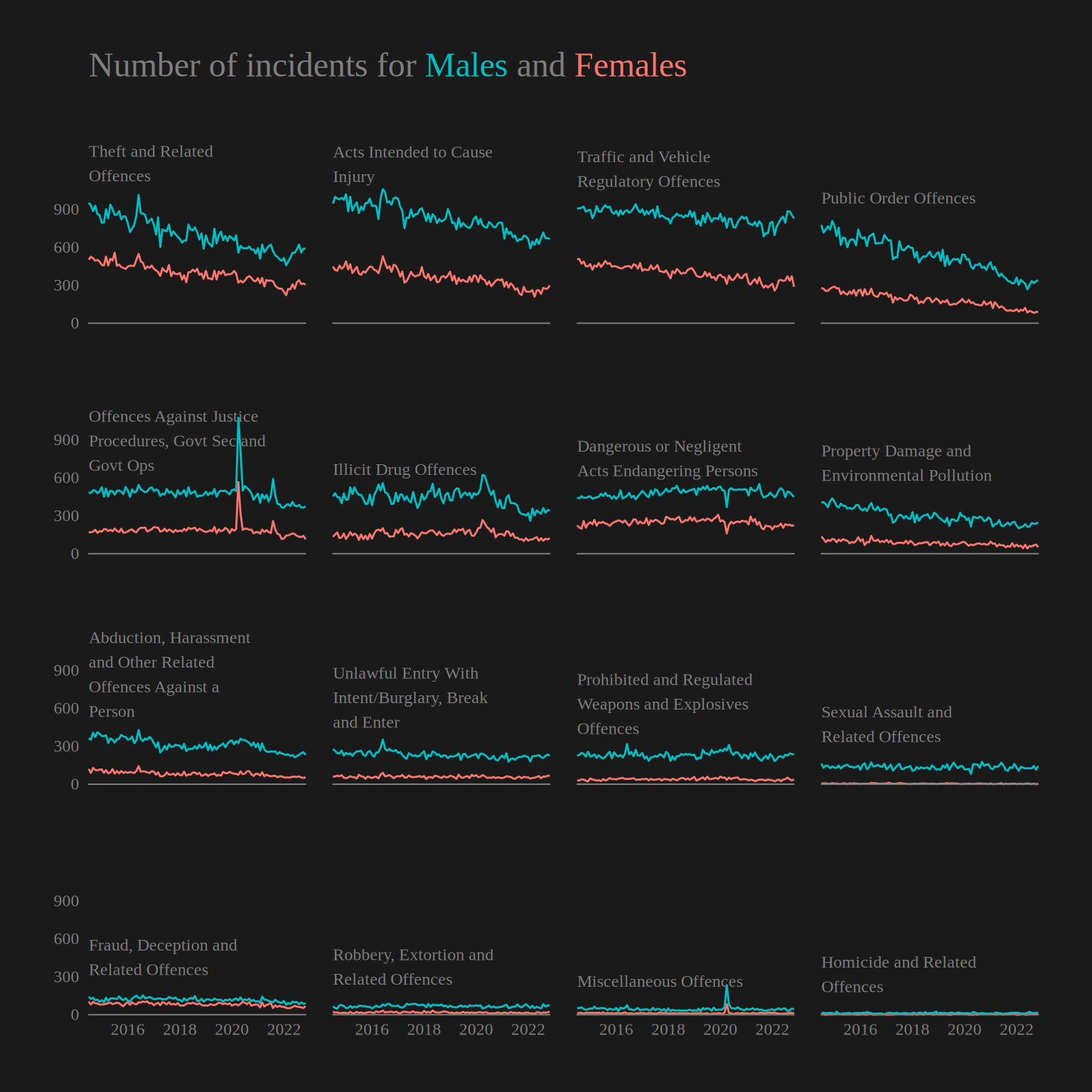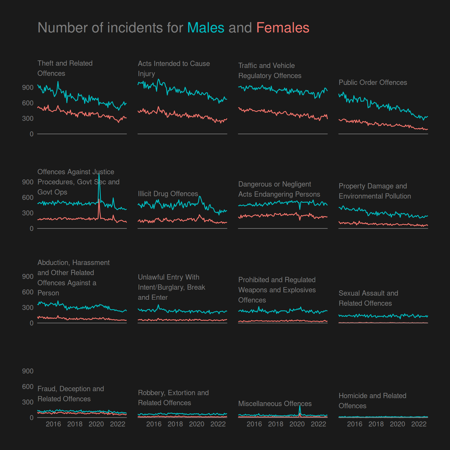 - Are the trends in the number of incidents over time the same for Male and Female offenders?