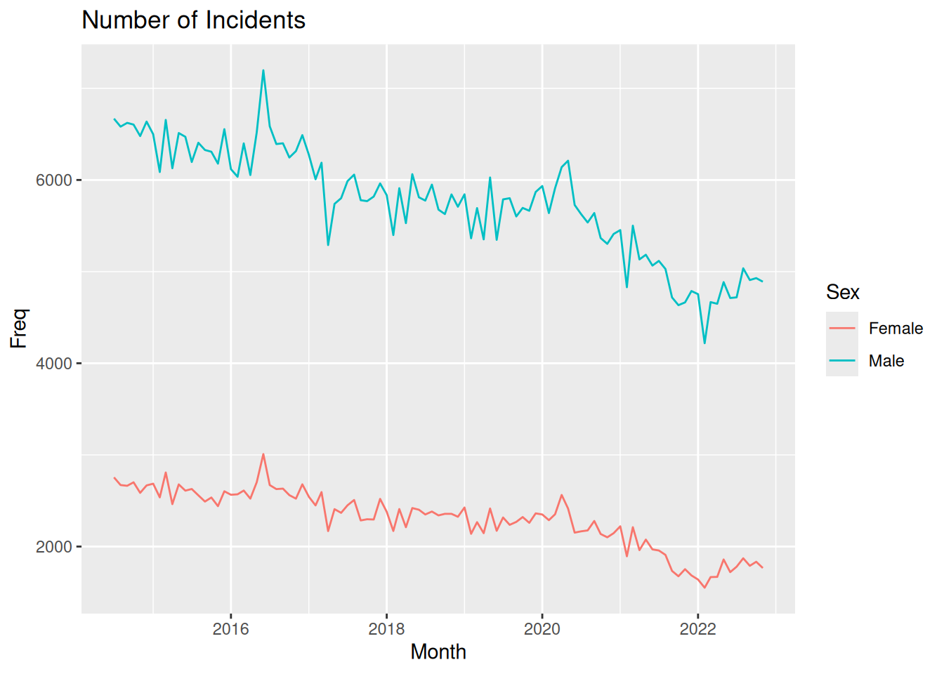head(crimeSex) Date Sex Freq Month