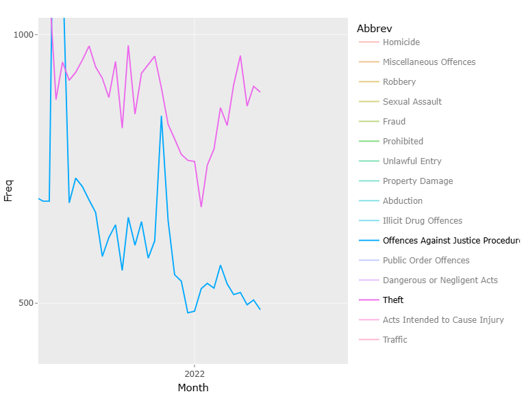 - Fx. Theft and Related Offences is on a downward trend except for increasing from year 2022 onward, as is true for other categories as well. However, for Offences Against Justice Procedures, Govt Sec and Govt Ops this is not true. Except for a big spike, the frequency of crimes for this crime type is close to constant, but does see a bit of a decrease from about 2022. See figure 4.