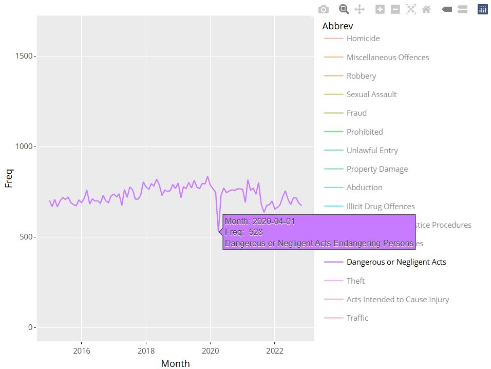 We create the interactive plot by using the plotly::ggplotly function on our created plot, where we take advantage of the unofficial aesthetic text supported by plotly to create tooltips to ensure we get the entire crime type label on the tooltip.