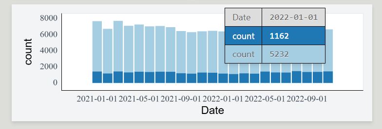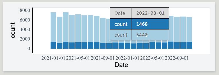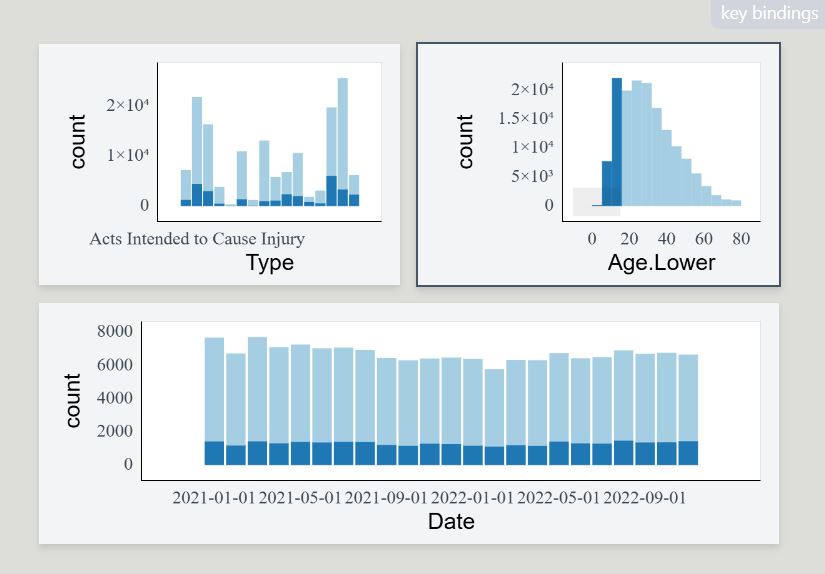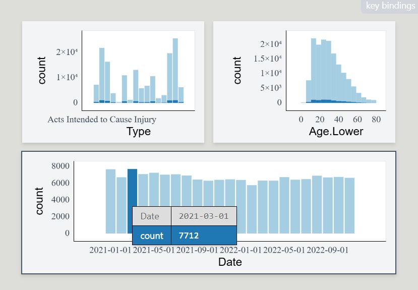 crimeRecent <- subset(crime, Year >= 2021)Create the linked interactive plots with plotscaper with the correct layout by creating a schema with create_schema and using the set_layout function to control the placement of the figures.